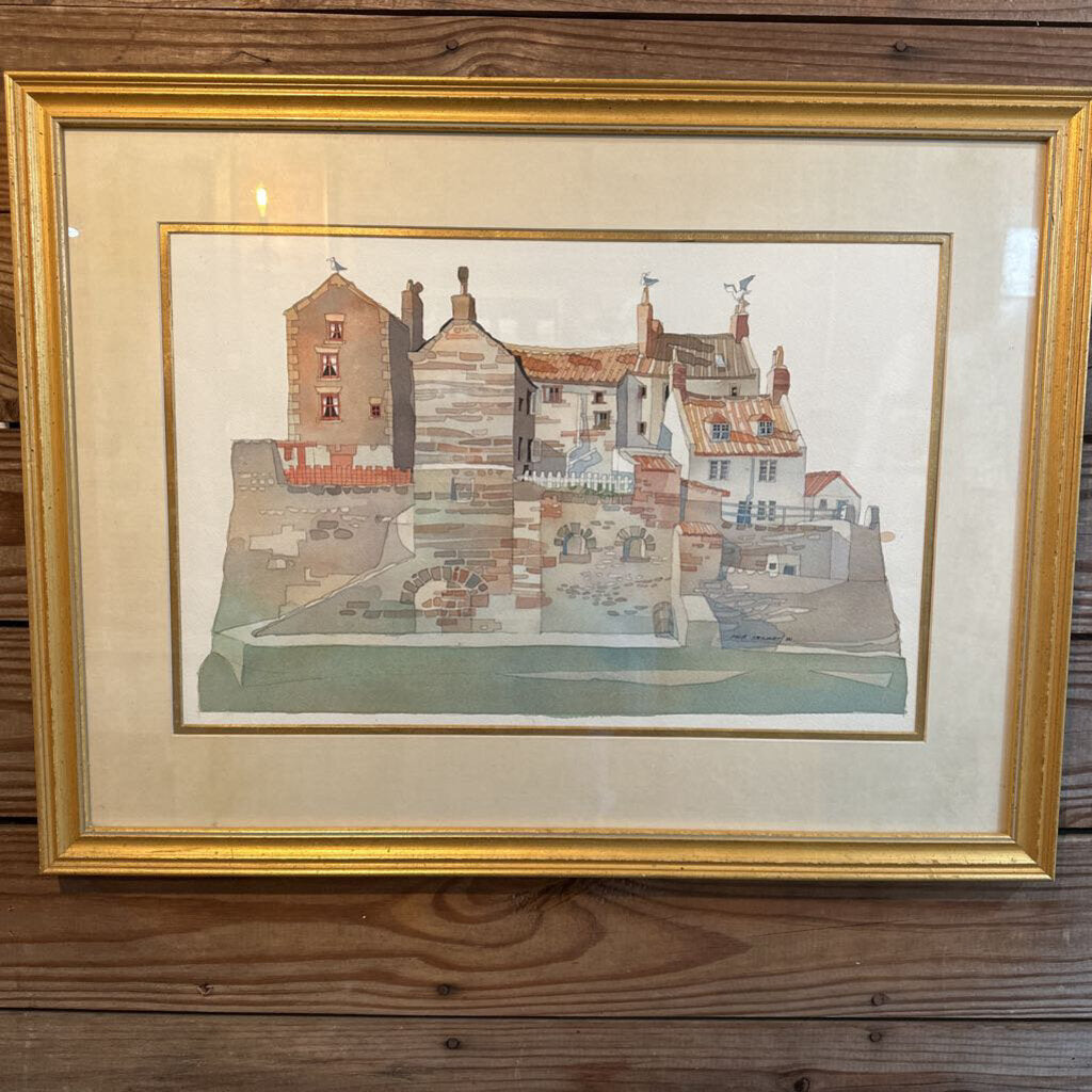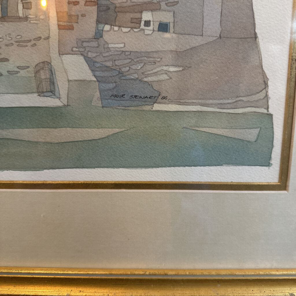 MUIR STEWART "BIRD ON IRISH HOUSES" WATERCOLOR