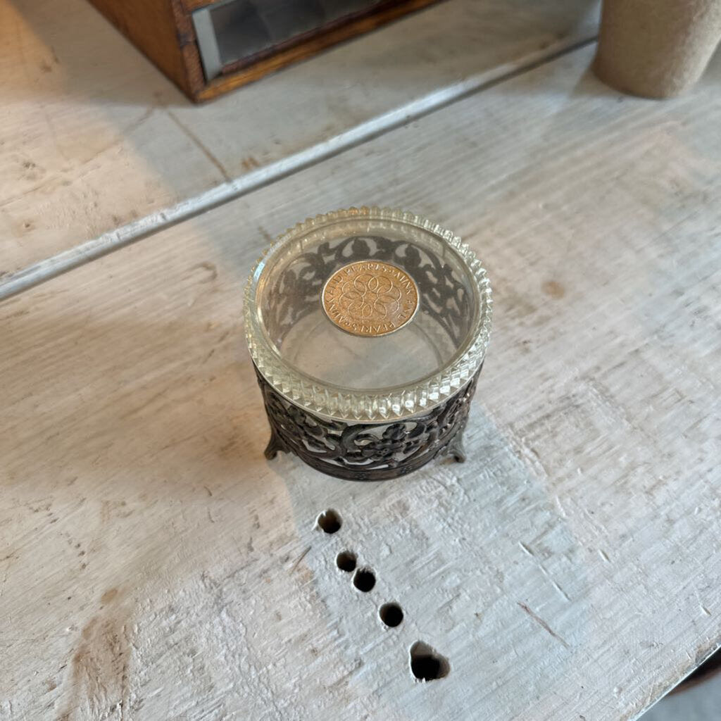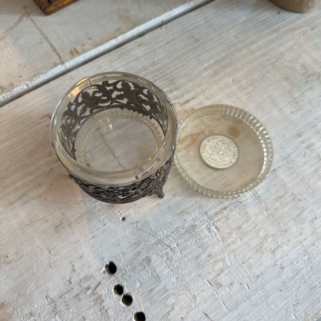 VINTAGE JOVAN MINK AND PEARLS VANITY POWDER BOX WITH METAL FILIGREE STAND